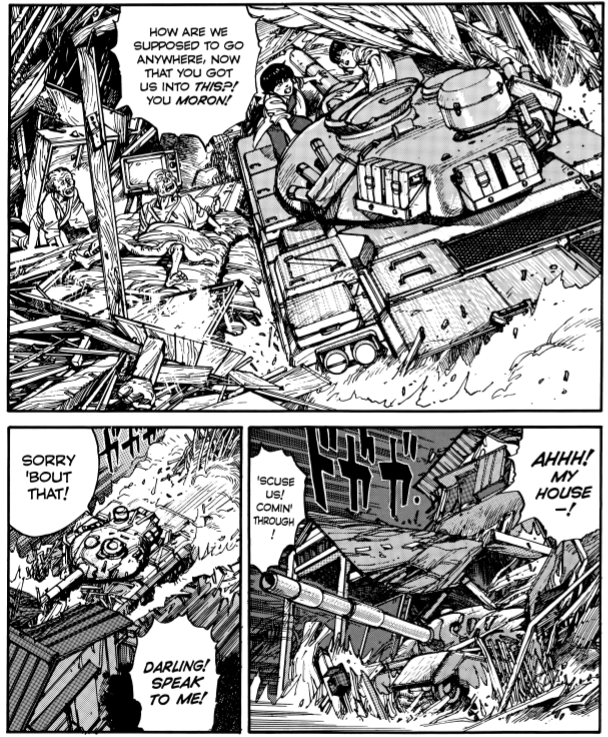 My favorite moment of this occurs in volume three, which is all about the Colonel, Nezu, and the remaining dissidents of Kei and Ryusakui’s resistance group all vying to capture the titular psychic prodigy Akira. The interweaving of these factions and the escalation of their conflict from inter-group disputes and squabbles to assassination attempts and a full on tank fight in civilian territory is truly captivating. The intercutting of these conflicts reminded me a lot of the masterful work George Miller did for the 2015 film Mad Max: Fury Road. There’s a constant sense of forward momentum and chaos, but on the page it's all perfectly legible and totally exhilarating. The paneling is buttery smooth– I can’t recall a moment throughout the entire series where Otomo’s layouts were ever confusing or hard to parse. The direction of action is always clearly guiding the reader’s eye from moment to moment and the scale and page count at which Otomo is able to maintain this sense of building tension and pacing is impressive. Of course, I would be remiss not to shout out some of the assistants that contributed to this project, including future anime auteur Satoshi Kon, who undoubtedly helped this series keep up its insane level of quality over the course of its bi-weekly schedule across eight years of serialization.