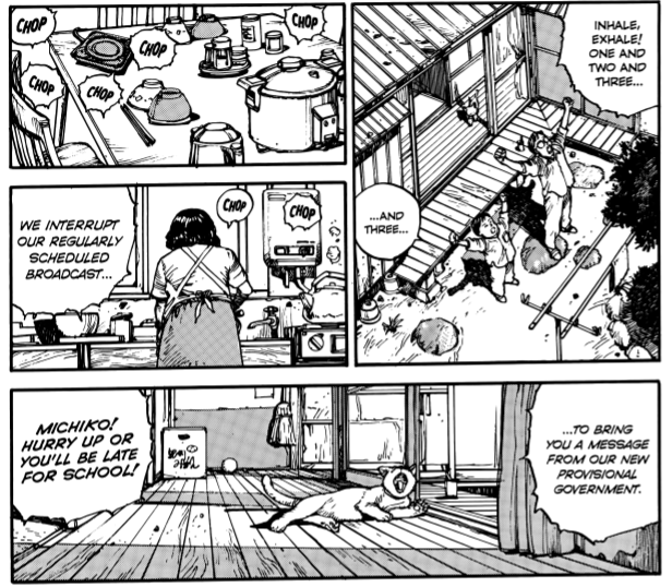 Plus, while I may be critical of the way Otomo may lavish in the destruction and military tech on the page, there are exceptional moments of humanity he injects throughout the manga. At its best, the manga does a good job at emphasizing the immense human toll of this avoidable conflict, such as in aforementioned volume three where we cut from Akira starting a new psychic bomb to a montage of average civilians getting ready for school and work. It’s a chilling calm before the storm moment as we watch these normal families converse while on their TVs the announcement of martial law is rebroadcast. It captures the mundane reality of the everyday people caught in the middle of these military conflicts. Even as the government is couped by the military and citizens are ordered to remain indoors, these children get up and have breakfast. It makes the impending destruction caused by Akira all the more impactful and haunting as a result.
