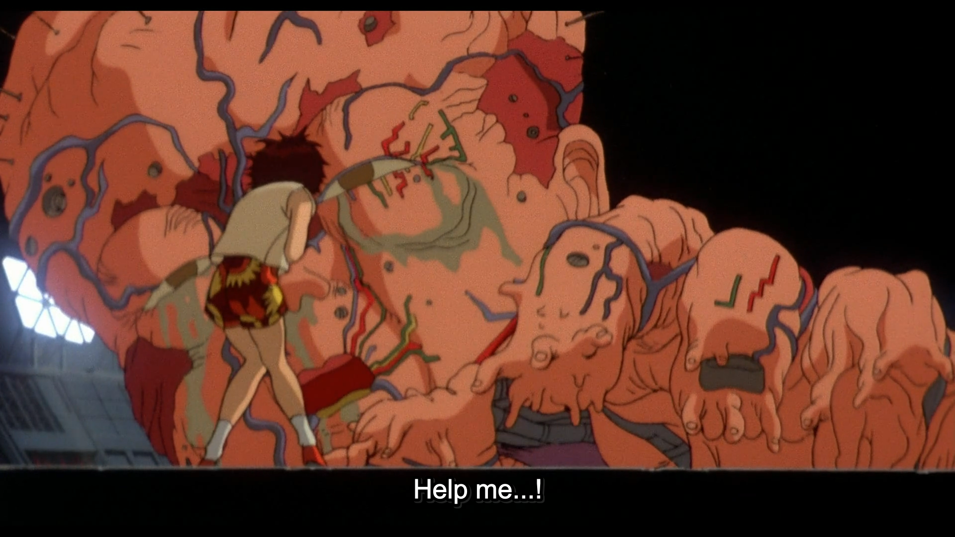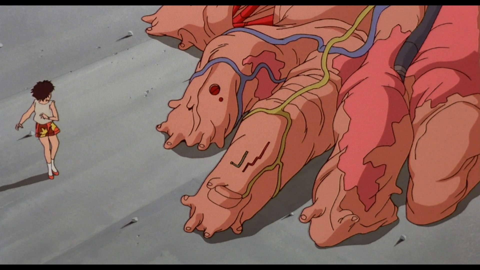 However, more impressive than the action to me is the body horror of the film’s climax. At the time of the manga’s hiatus, readers had only caught a glimpse of the transformation caused by Tetsuo losing control of his ever growing psychic abilities. As such, the film version of Akira serves as the visual basis for the future chapters of the manga, depicting Tetsuo’s morphing into a blob of flesh and machinery. The cuts of Tetsuo in these climatic moments of the film are pure body horror. There are at once primordial and futuristic: Tetsuo’s metal arm spreading out like computer wires, while his flesh ultimately transforms into the visage of a newborn infant. It works wonderfully with the motifs of early childhood that are present throughout the rest of the work with the appearances of the fellow psychic subjects and their often childlike approaches to antagonizing Tetsuo earlier in the film with stuffed animals and milk. All of this is matched wonderfully sonically–the psychic children like Masaru and Kiyoko have these eerie flat, young voices that contrast with their aged bodies. Meanwhile, the soundtrack, composed by the collective Geinoh Yamashirogumi, gives the action and horror a thumping drum backing mixed with Bulgarian style harmonies for pulse-quickening and unsettling effects.